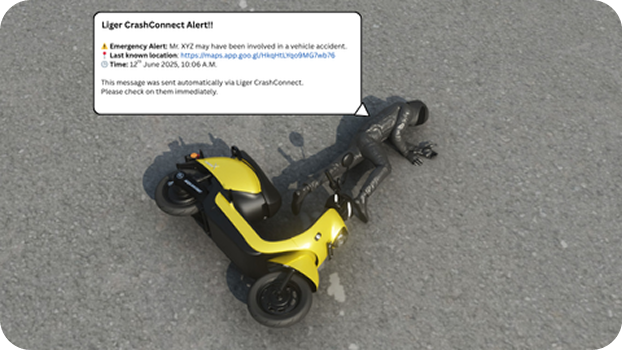 In the unfortunate event of a collision, Liger Intelligence springs into action — sending an automated Fall alert with your live location to your registered emergency contact via the Liger Connect app.